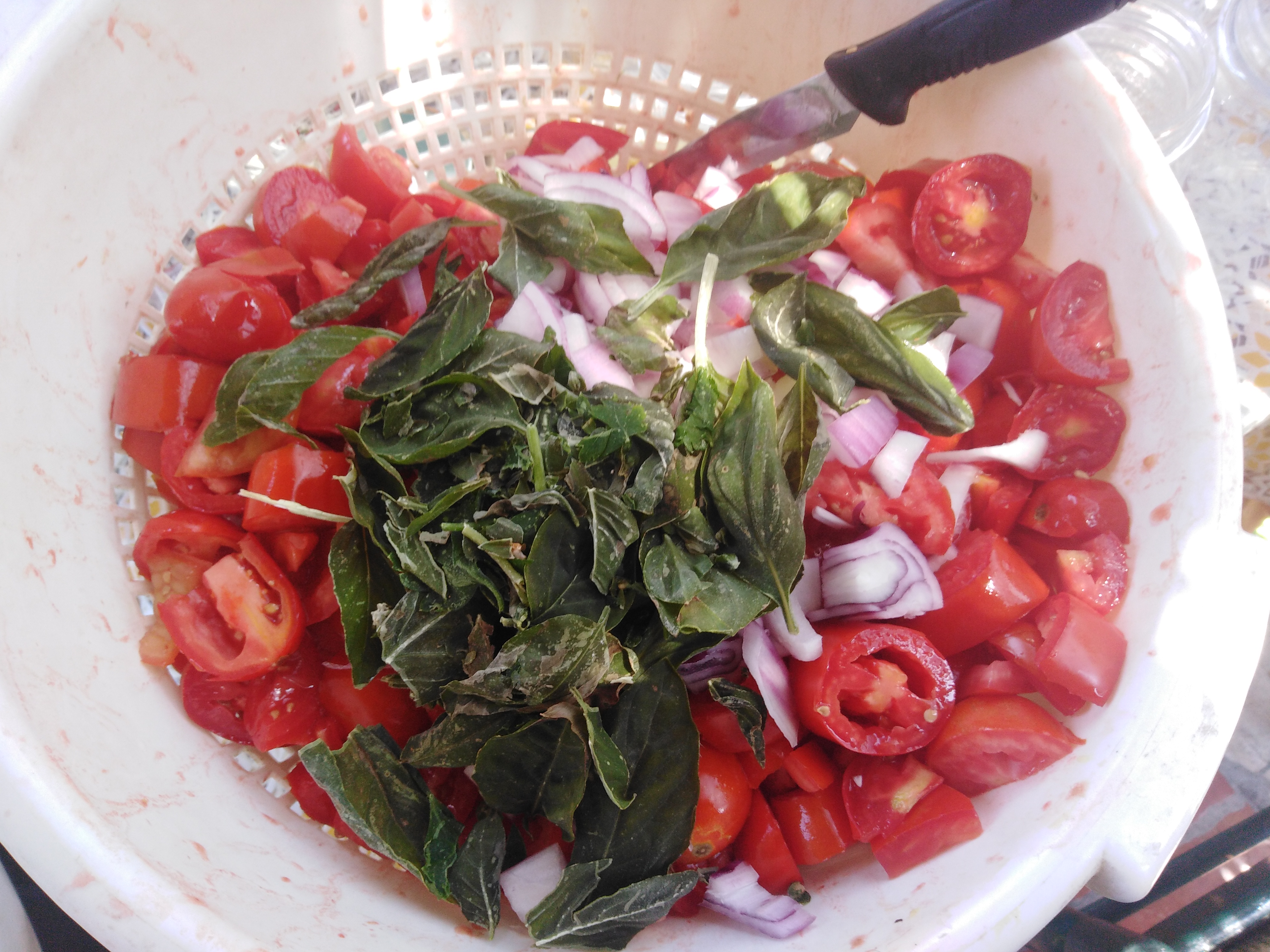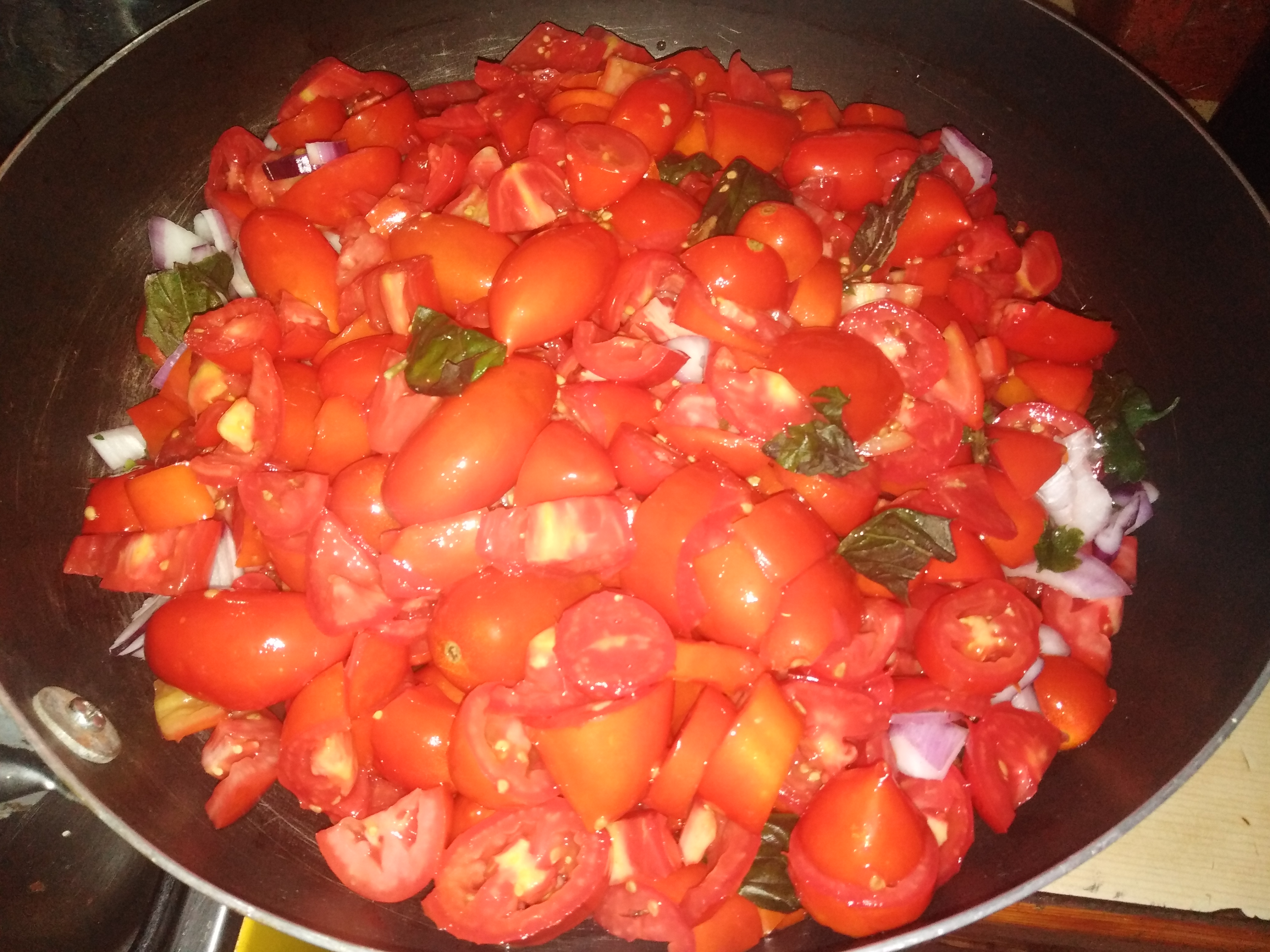 Poi o tagliato e messo a marinate per 30 minuti il tutto con cipolla Rossa e basilico,creando un acqua di pomodoro Che utilizzero’ ad inizio cottura.
