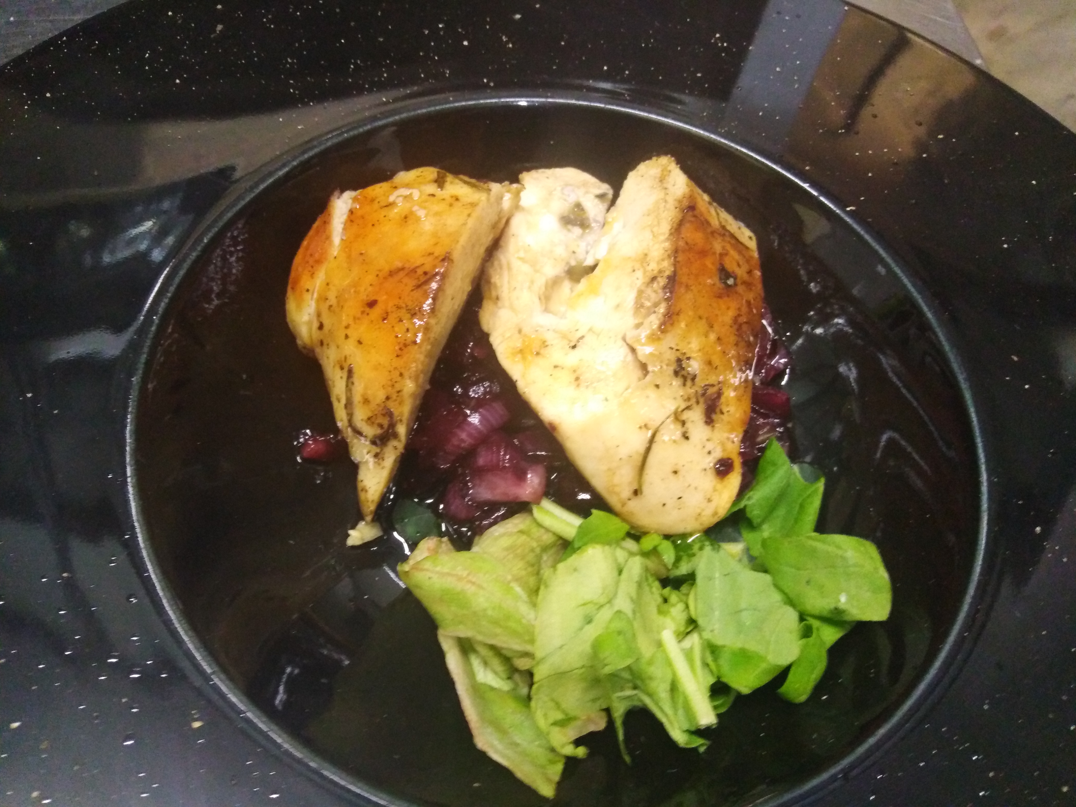 Prendere un petto di Pollo intero, apritelo a libretto e farcitelo con prosciutto cotto e provola a dadini,aggiungete un trito di melanzane alla griglia conduits con olio e sale. Legate con un filo a modo porchetta… Rosolate in padella antiaderente con un filo di Olio e del rosmarino fresco, infine tagliate in tre parti. .finite la cottura in forno. A parte Rosolate una cipolla Rossa tagliati molto sottile con un filo di olio,a meta’ cottura aggiungete 1 cucchiaio di zucchero e un bicchierino da caffe’ di aceto di vino, finire la cottura per 10/15 minuti, aggiungere un pizzico di sale e servire con il pollo e del lattughino fresco.
