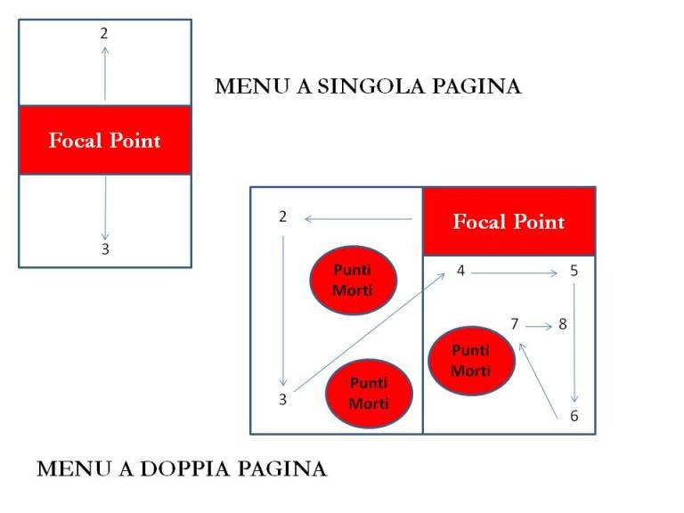 L’occhio secondo studi recenti, fatti mettendo delle micro telecamere su di un menu’, ha dei punti morti dove l’occhio non cade proprio Mai!!! ,ecco in quegli spazi non va scritto nulla, o quanto meno I prodotti con marginalita’ inferiore.